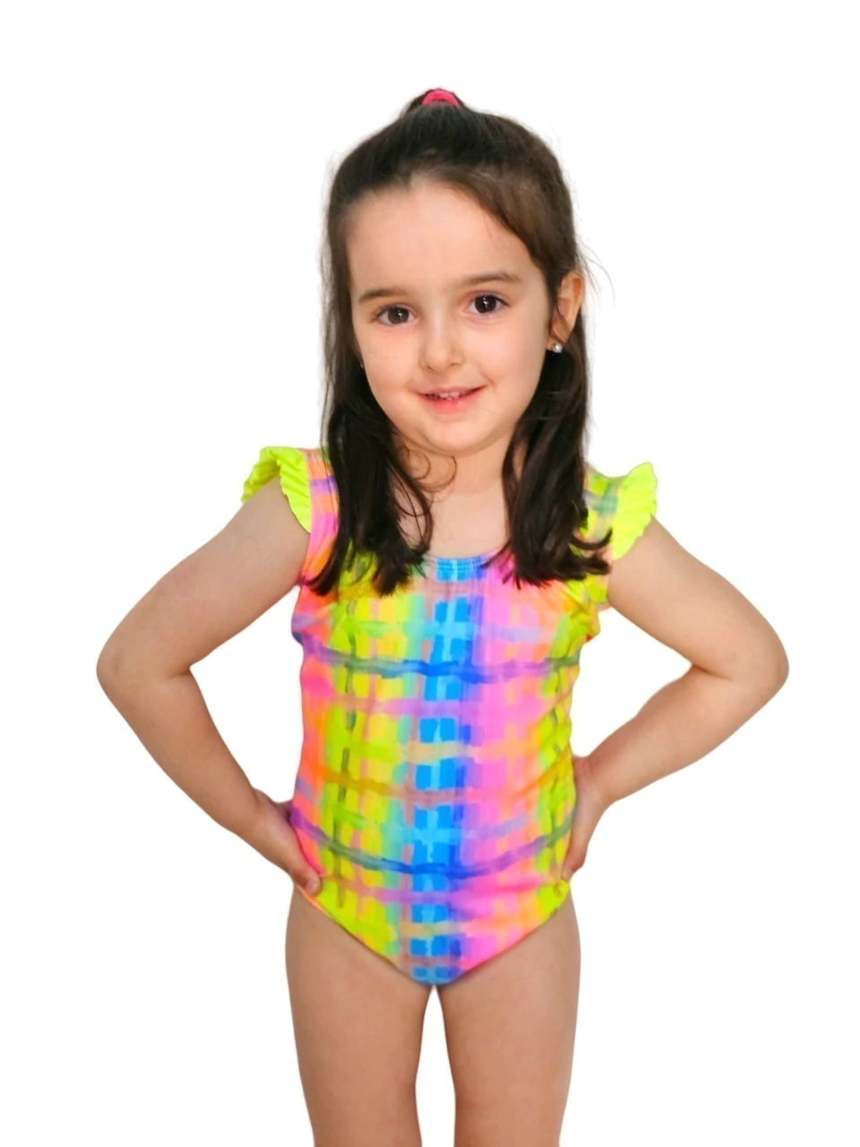 Malla de colores para nena. Viene multicolor y voladitos en los hombros. Hecha con un tipo de lycra que brinda elasticidad con memoria. dando calidad y durabilidad.