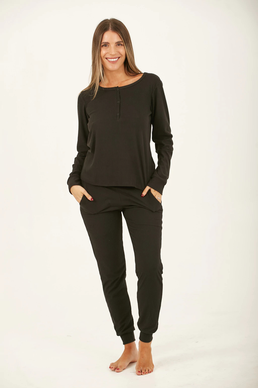 Pijama en morley de algodón liso con botones. Pantalón con bolsillos.
