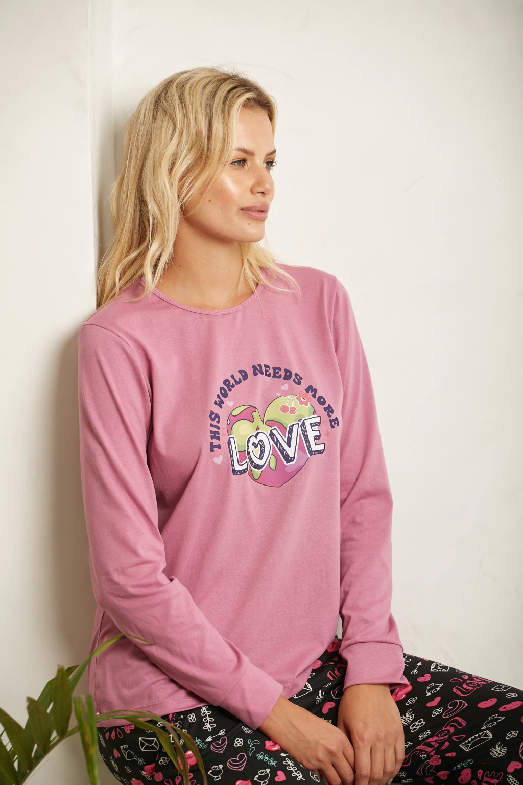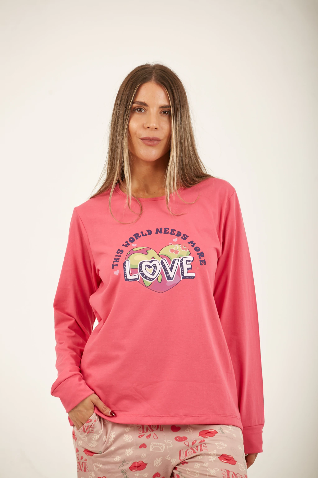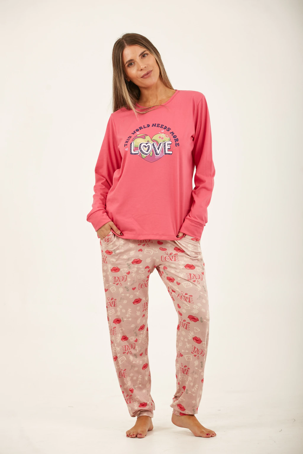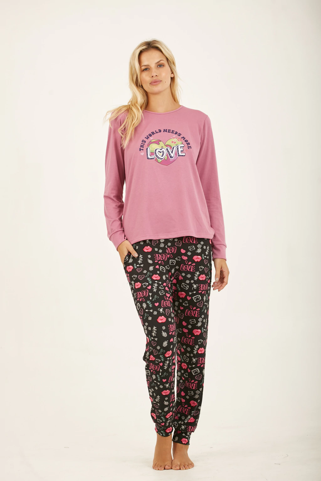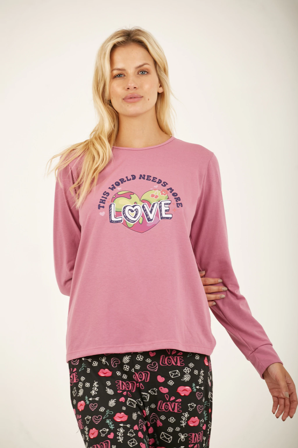 Pijama en jersey de algodón combinado. Pantalón estampado con bolsillos y puño. Remera con estampa en el frente.